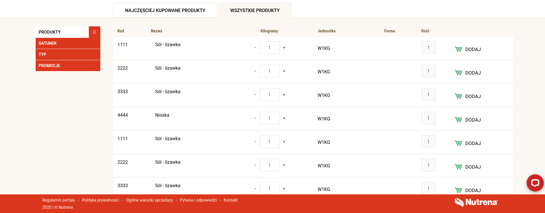 The list consists of two parts – the side panel containing categories and a list of products. After selecting a category, the list displays only a given selection. There are two tabs above the list of products – they allow you to either show the entire list of goods available to the customer, or filter them down to those that have already been purchased by your client.